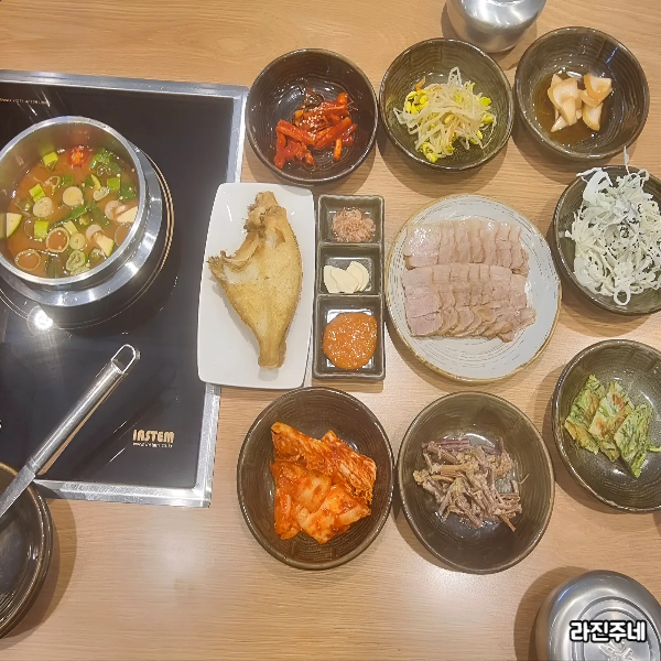 메인인 촉촉한 보쌈을 중심으로, 무려 10가지가 넘는 다양한 밑반찬들이 빈틈없이 상을 채웠어요. 여기에 뜨끈한 된장찌개, 노릇하게 튀겨진 가자미 튀김, 신선한 쌈 채소, 그리고 윤기 좌르르 흐르는 쌀밥까지! 14,000원이라는 가격이 믿기지 않는 엄청난 구성이었죠.