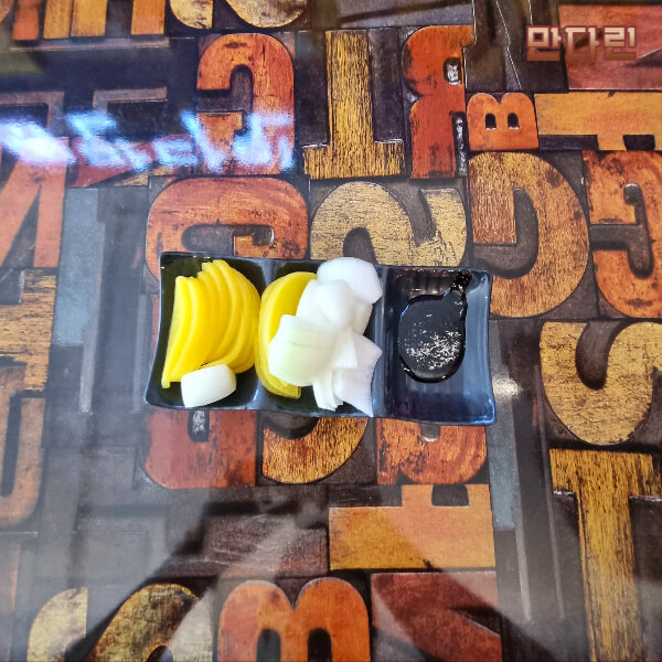 가게에서 선불로 계산을 하고 셀프코너에서 단무지와 양파 등 여러 가지 식기들을 맘 편히 이용할 수 있습니다.